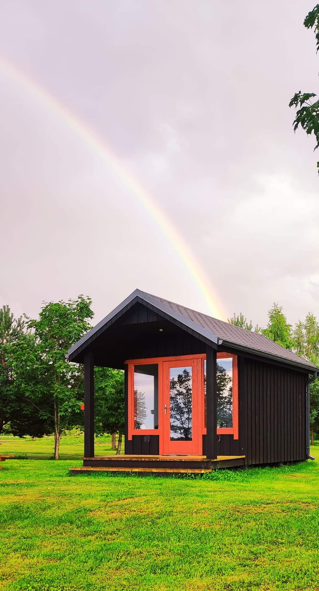 Apsildāmi, minimālistiski koka namiņi ar skatu uz ezeru.
