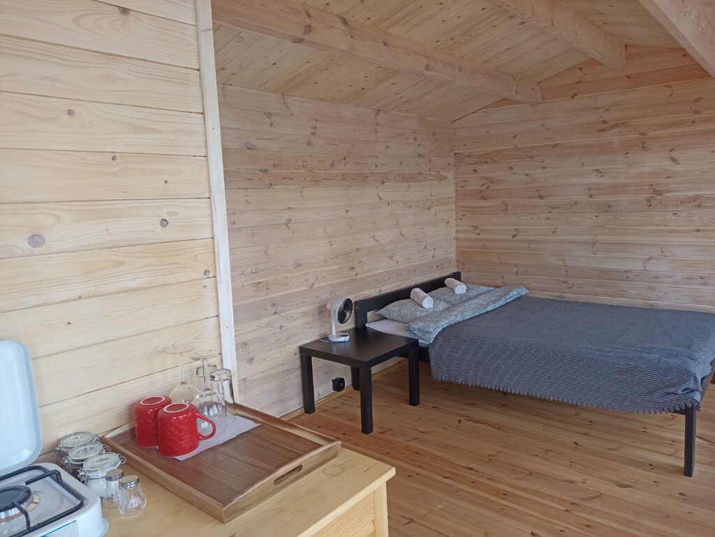 Namiņā – divvietīga gulta, gultas veļa, dvielīši, wc, neliels virtuves stūrītis ar gāzes plītiņu, gāzes sildītājs, salokāmie krēsli, 12V elektrība (USB). Uz namiņa terases – divi atpūtas krēsli, galdiņš, mazais grils